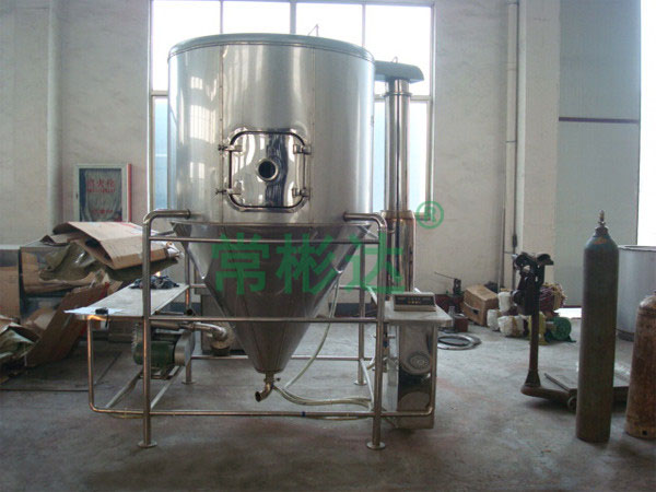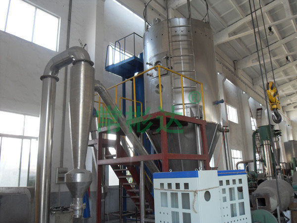 空氣經過濾和加熱,進入干燥器頂部空氣分配器,熱空氣呈螺旋狀均勻地進入干燥室。料液經塔體頂部的高速離心霧化器,(旋轉)噴霧成極細微的霧狀液珠,與熱空氣并流接觸在極短的時間內可干燥為成品。成品連續(xù)地由干燥塔底部和旋風分離器中輸出,廢氣由風機排空。